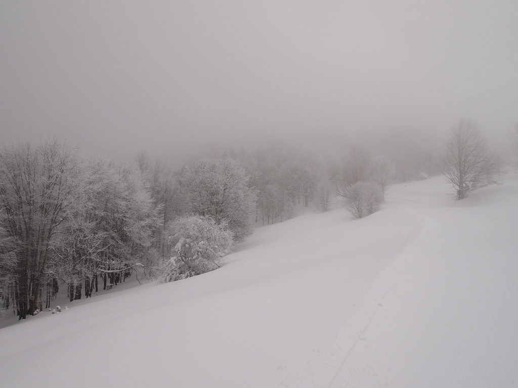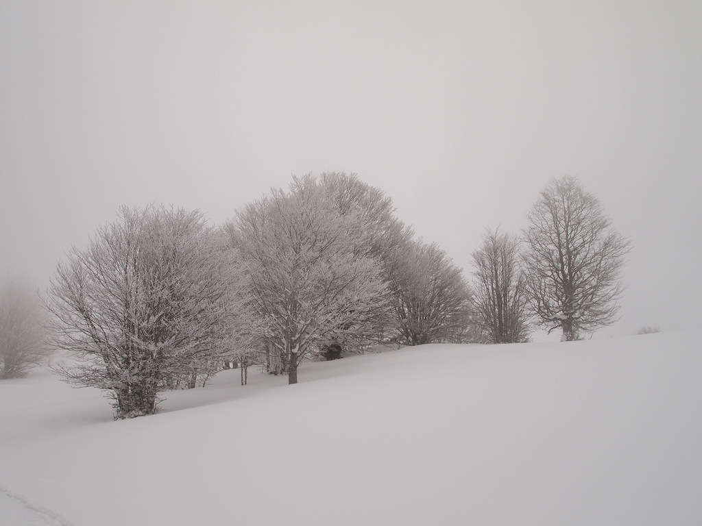 The mountains are cloaked with cold, and the return of the pelicans means we’re monitoring them from the ridge again. But a day after the Russian meteor filled the flat sky of our screens we arrived to find our vantage point hazed by winter cloud. Our breaths pillowed ahead of us with each step. Hoping for a better view farther along, we climbed through a beech forest deep with drifted snow, each twig and branch sealed in the glass of a hoar frost. We’d entered a crystal mountain palace, an ice-world veiled in mist. Cloud sifted across the slopes, and all about us the silence and snow ensnared us.