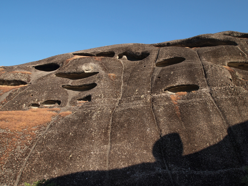 The nearest anyone has come to explaining the origins of the remarkable rocks of the Meteora – meaning suspended in air in Greek – is the German geologist Alfred Philippson. In 1897, he suggested that a river once ran into an ancient lake that covered what is now the plain of Thessaly, depositing in the same place where the Meteora have risen its rippling debris of silt, gravel, mud and water-smoothed pebbles and stones. Some 60 million years ago the river’s estuary was an alluvial fan that opened and spread from its point of entry into the lake. Over the course of thousands of years the layers of the fan deepened, eventually being compressed by the immense forces of water and earth into conglomerate – a type of sedimentary rock composed of the pre-existing stones that the river had washed into the lake – that was concreted together by hardened sandstone. When a massive earthquake emptied the Thessalian lake by cleaving open a channel to the Aegean Sea, the deltaic cone at the end of the river was raised from the lake bed into the sky. Loose sandstone was rinsed away by rain and the stone pillars were further worn into their present sinuous forms, riddled and pocked with caves and fault lines, by wind, weather and subsequent movements of the earth.