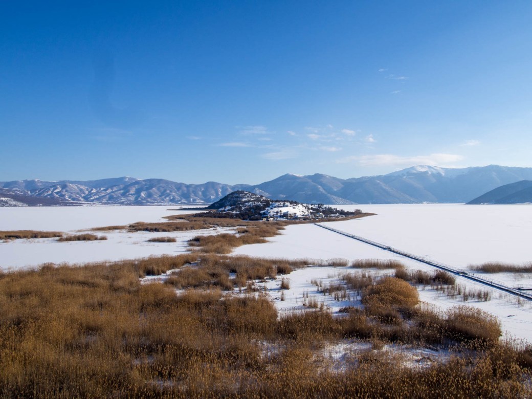 Lesser Prespa Lake is shallow, and more graceful in its shape. In its encircling reedbeds dwell seven species of herons, alongside the world’s largest colony of Dalmatian pelicans. In winter it can freeze as solid as a shield.