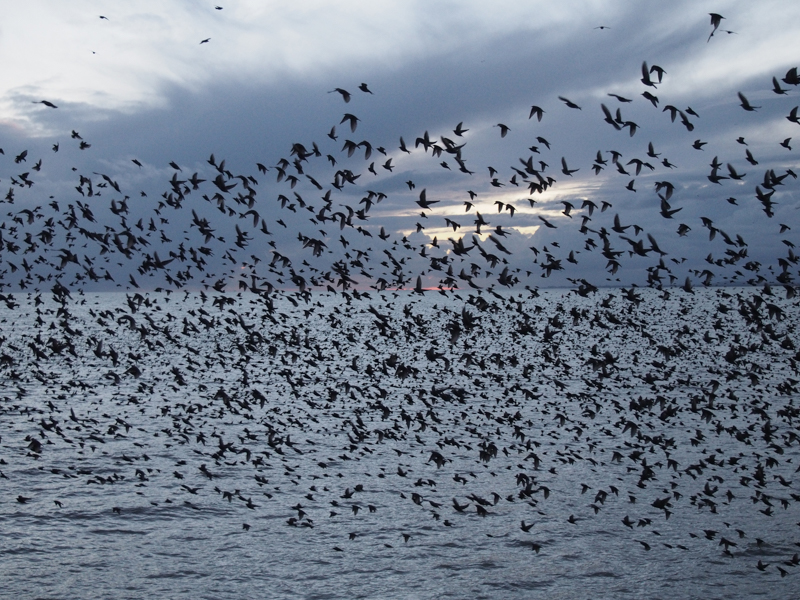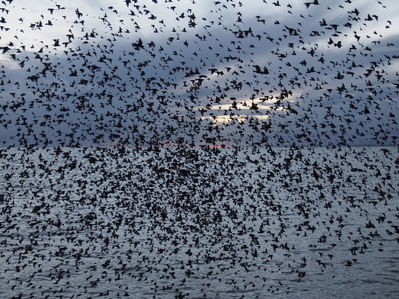 Eight starlings hustled overhead like a fan of thrown darts, roving the glimmering grey sea between piers. A minute later and another twelve had joined them, followed by countless small additions and accretions over the next quarter of an hour, so numerous that I could no longer keep track of their source. It was as if they were simply materialising from within the growing assembly in an endless process of self-replication, or being sieved unseen from the sea. As if in response to the swirling birds, several hundred of them now fusing into a mass of rippling black felt, dark clouds billowed westwards, pressing the last of the winter light into a thin shining seam between horizon and sky. And from that sliver of crushed sun, the rays flared outwards and over the sea, unwinding like a trawler’s net and raining light on the wheeling birds.