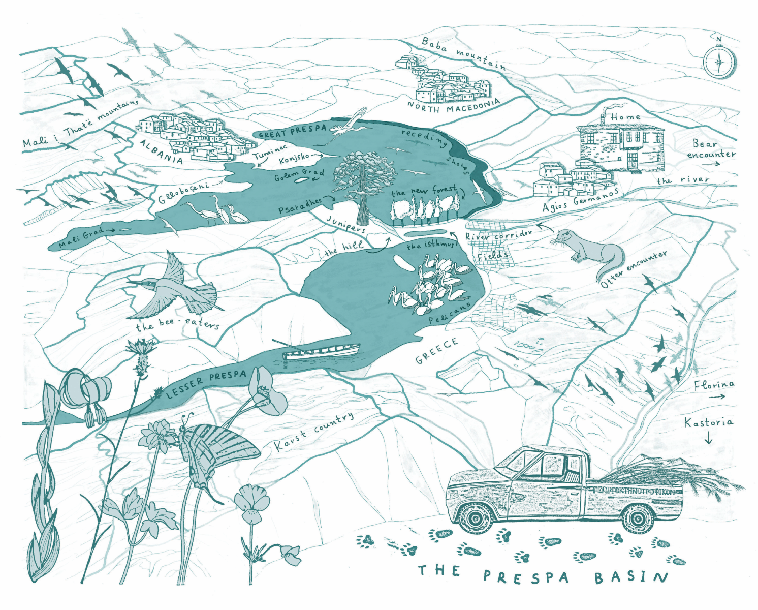 Julian: One of the things that I love about the map that you created for the book is the absence of borders. The names of the three countries that share the Prespa watershed are clearly there – Greece, Albania and North Macedonia – but the dividing lines are missing. Can you tell me about that decision and why you felt it was important to leave the lines off the map, even though the three countries that come together around the water are still visible?